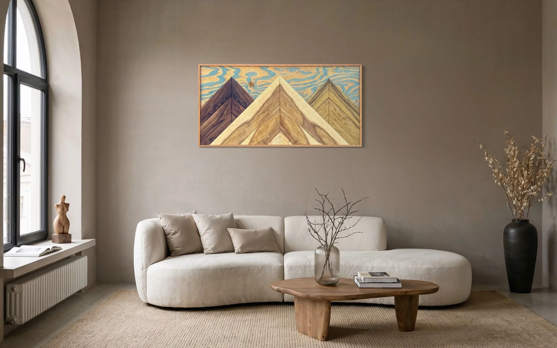 A play off our Wide Range design, this piece was inspired by the Truckee River running through the mountains. The Mountains are all naturally colored, using a variety of different exotic woods to create the gradient of light to dark mountains and natural wood rounds are used for the sun and the moon. We used our signature burning and brushing technique to create the effrecgt of the water and it was all hand cut to fit together.